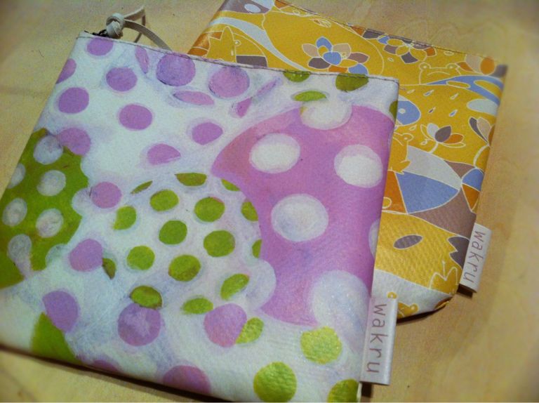 写真は新作のポーチです。wakruオリジナルの柄をプリントしてみました。素材はターポリンを使用しているので水に強くて丈夫です◎