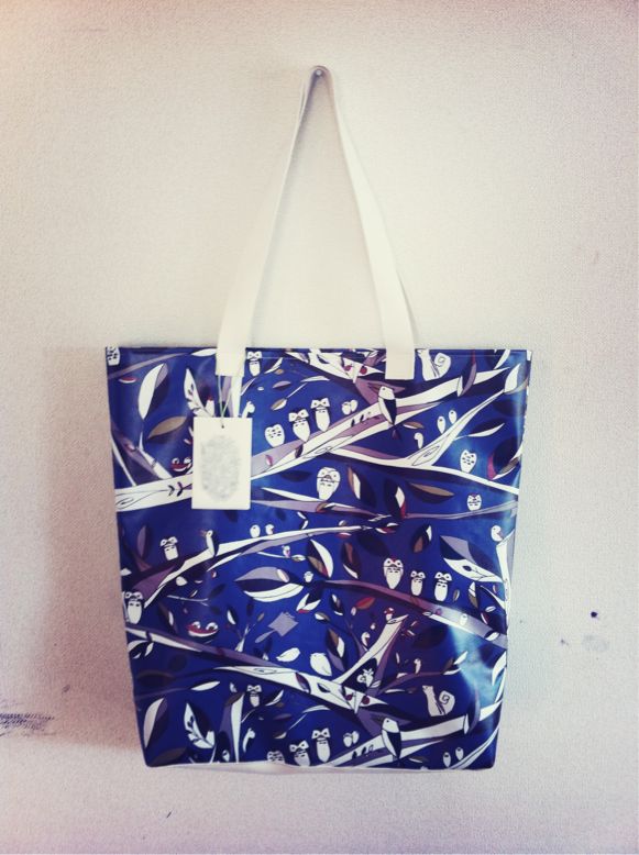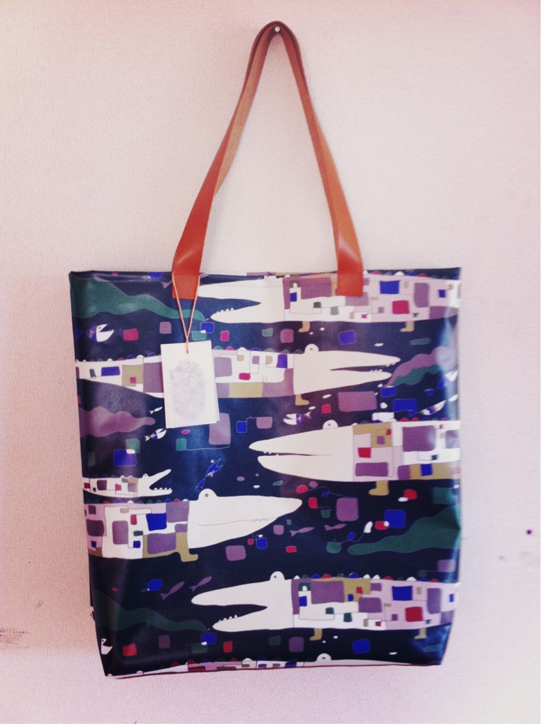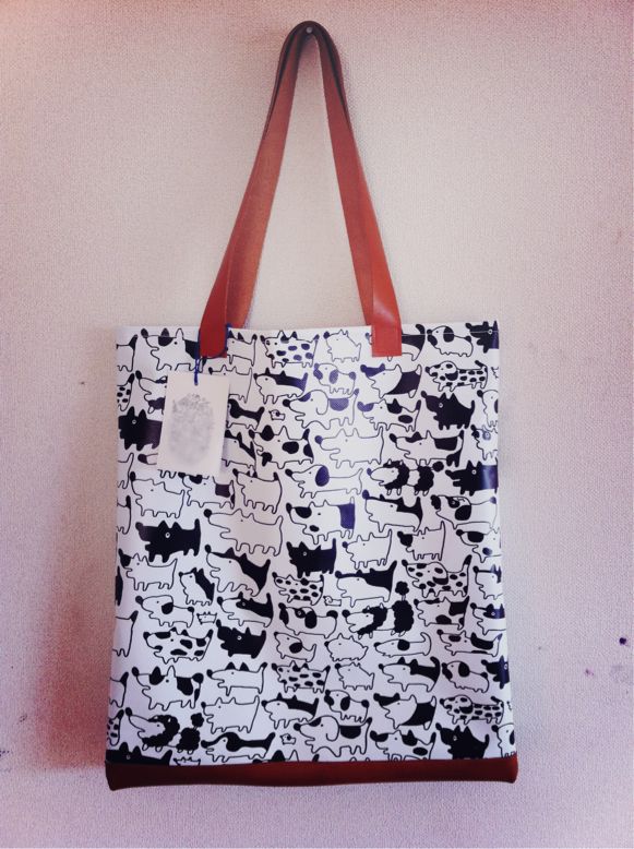 今回はターポリンという素材にプリントして、底と取っ手に革を使ったトートバッグを制作しました。