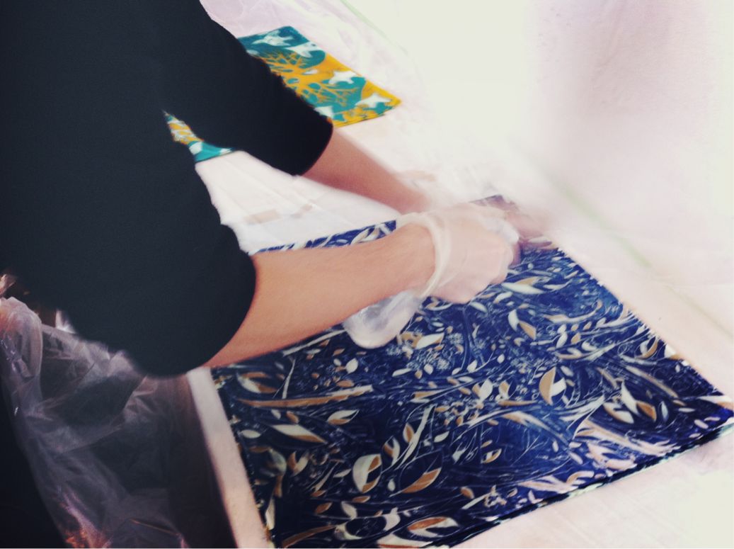 染料をのせたハンカチに薬剤をかけて色を定着しています。